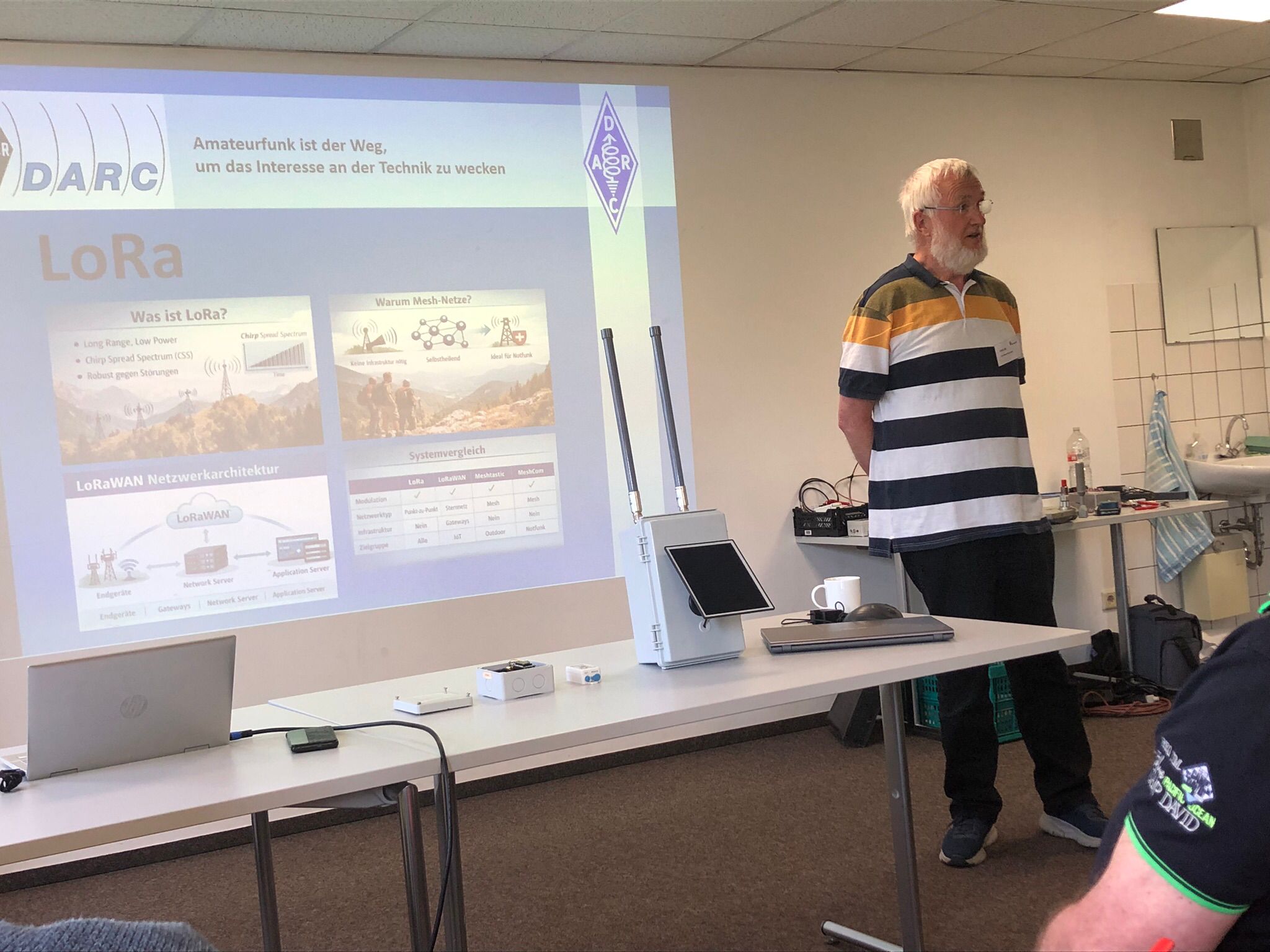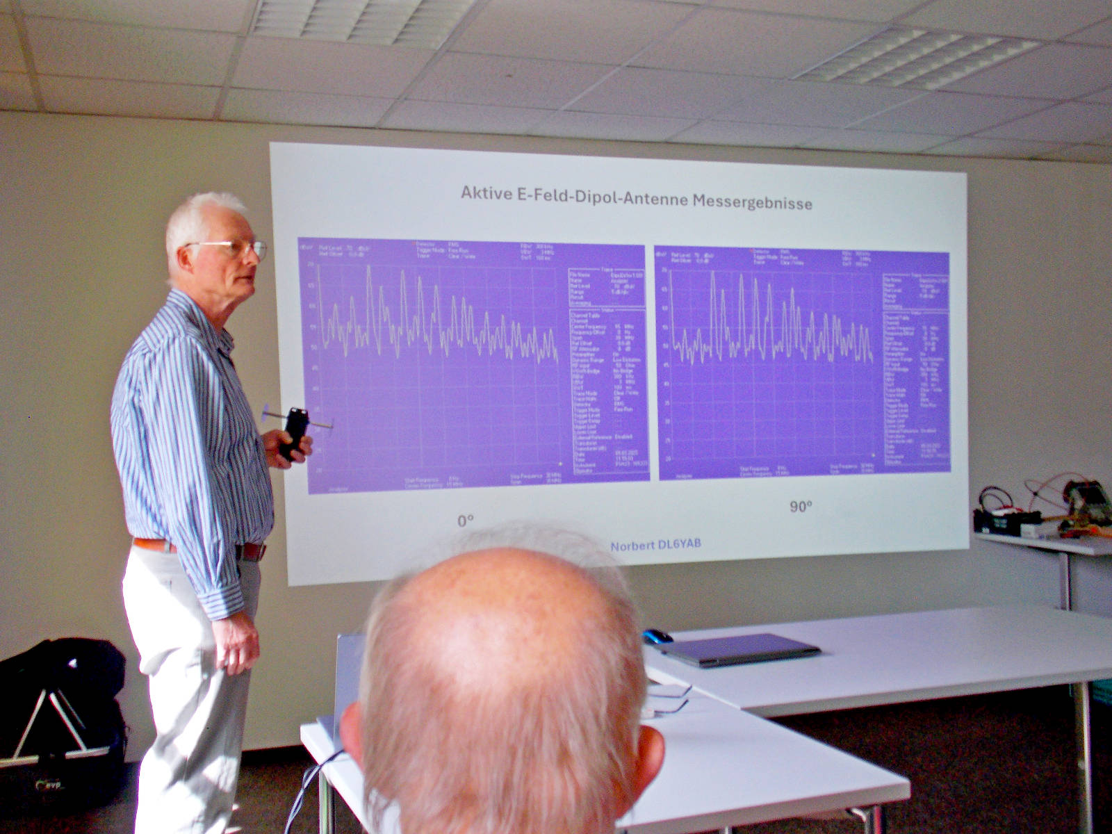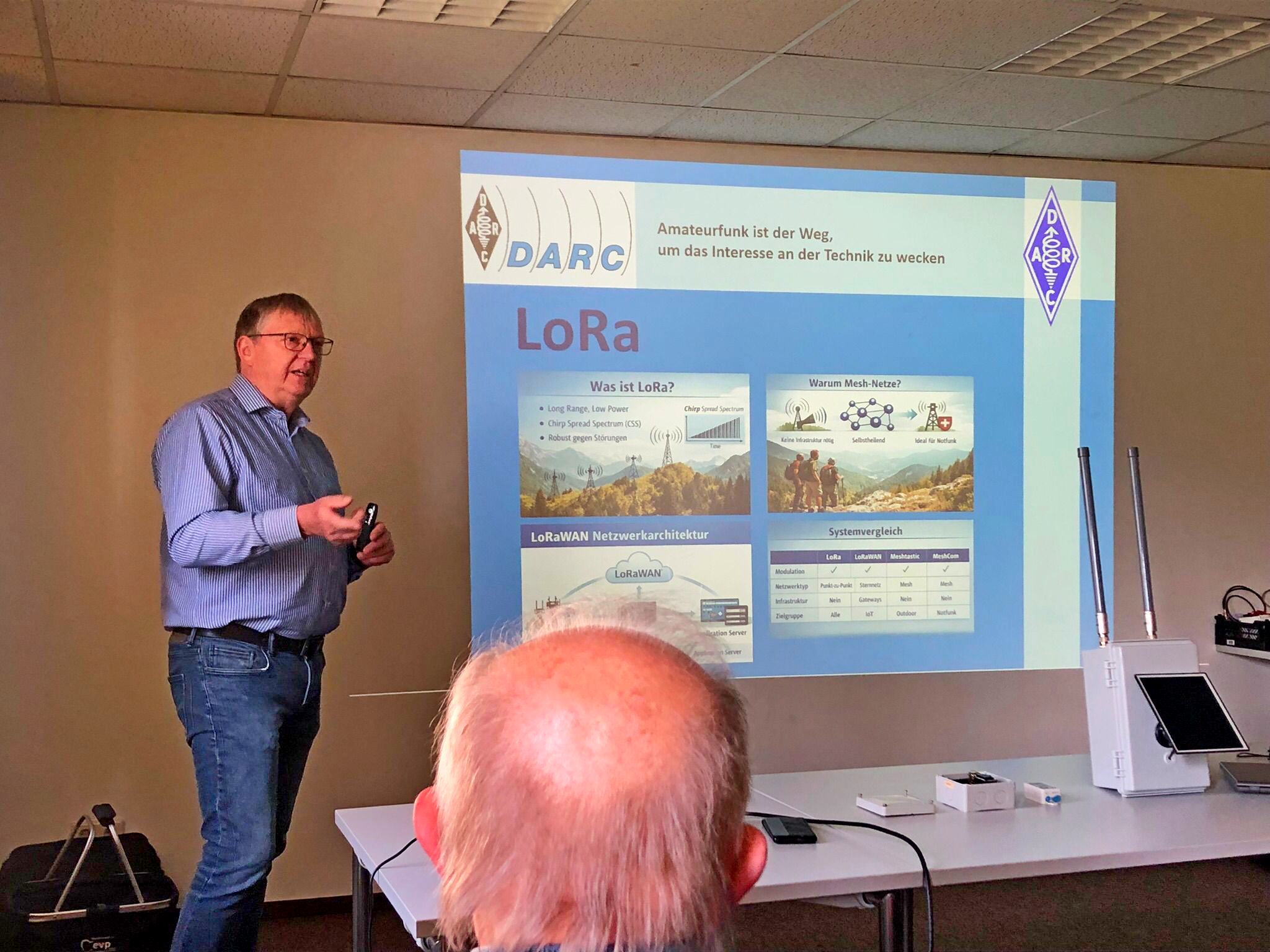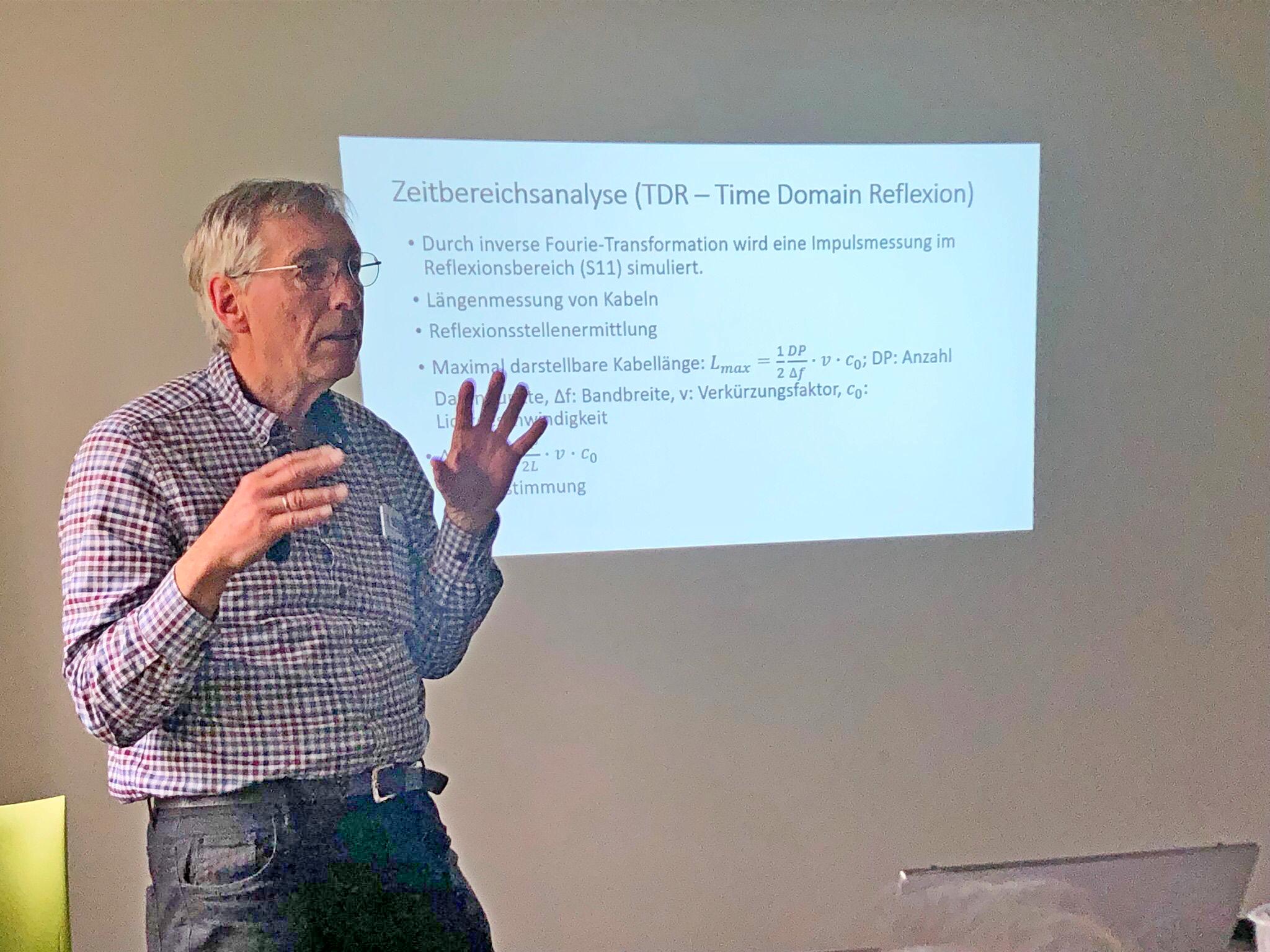 Josef, DL8DBN, stellte die LoRa-Modulation vor und gab einen Überblick über LoRaWAN sowie MeshCore. Anschließend präsentierte Norbert, DL6YAB, E- und H-Feld-Antennen für die Nahfeldpeilung und den Kurzwellenempfang. Heribert, DK2JK, nahm die Teilnehmer mit auf einen Streifzug durch die SDR-Technik. Den Abschluss bildete Günter, DK5DN, mit der Vorstellung verschiedener Messungen am NanoVNA.
